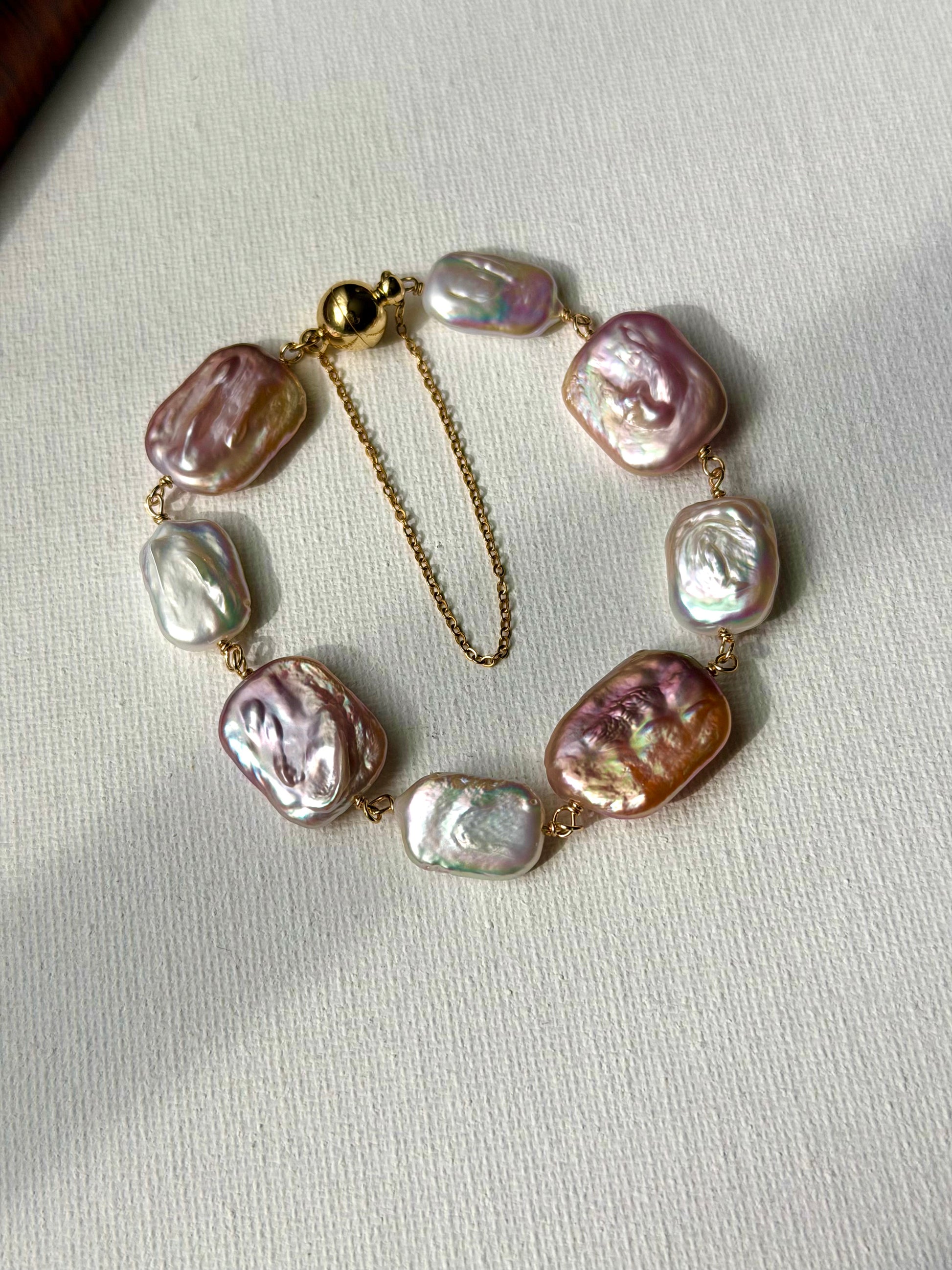 Baroque Pearl Magnetic Clasp Bracelet with Safety Chain – Natural Iridescent Freshwater Pearls, Gold Filled, Handmade Elegant Gift for Her